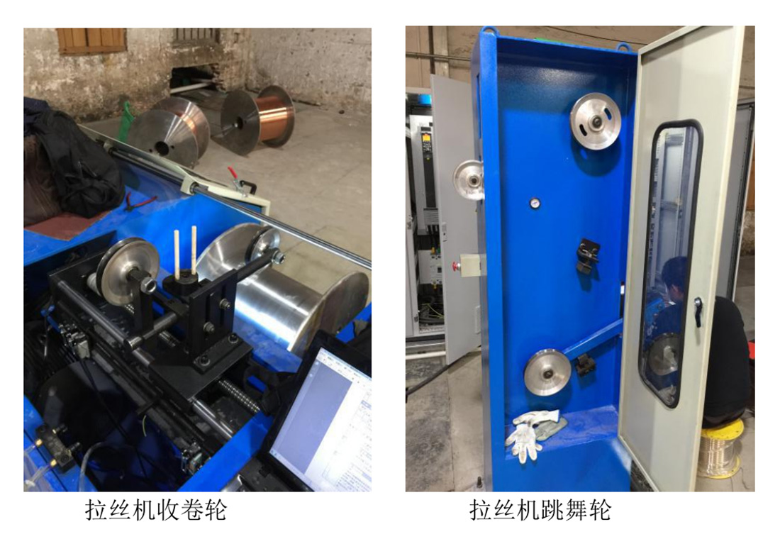 上面兩張圖片是我司技術(shù)工程師在廣東佛山某電纜廠拍的,因?yàn)楫?dāng)時(shí)我們主要是在現(xiàn)場調(diào)試后面的收卷部分,也是難點(diǎn)的一部分,所以就拍了收卷輪和跳舞輪的圖片。當(dāng)時(shí)現(xiàn)場的收卷電機(jī)是三相異步電動機(jī),功率為15KW,采用18.5KW的FC360頻器進(jìn)行控制。變頻器外接設(shè)備上檢測跳舞輪位置的滑動電阻,作為反饋跳舞輪位置的反饋信號;外接通過PLC 前饋計(jì)算后的模擬量輸出作為前饋信號。