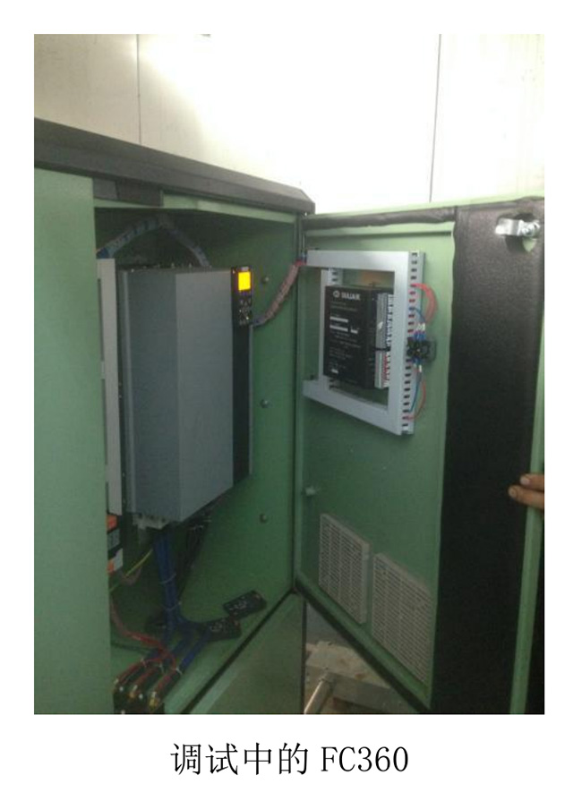 以上兩張圖片是我司在佛山某空壓機(jī)應(yīng)用現(xiàn)場所拍,我司的技術(shù)工程師正在調(diào)試FC360變頻器??諌簷C(jī)變頻調(diào)速控制原理是電動機(jī)拖動空氣壓縮機(jī)旋轉(zhuǎn),使之產(chǎn)生壓縮空氣,并存儲于儲氣罐中。儲氣罐中空氣壓力的大小取決于空氣壓縮機(jī)產(chǎn)生壓縮空氣的能力(本系統(tǒng)中即取決于電動機(jī)的轉(zhuǎn)速)和用戶用氣量之間的平衡狀況,為了保證供氣質(zhì)量,要求儲氣罐空氣壓力穩(wěn)定在某一數(shù)值上。儲氣罐內(nèi)的壓力為被控量,壓力變送器將儲氣罐的壓力變換成電信號送給變頻器PID單元,與壓力給定值進(jìn)行比較,PID能單元根據(jù)比較所得偏差的大小和方向按預(yù)定的 PID 運算規(guī)律運算后產(chǎn)生控制信號改變變頻器的輸出,從而改變電動機(jī)的轉(zhuǎn)速,使儲氣罐內(nèi)的實際壓力始終維持在給定值上。