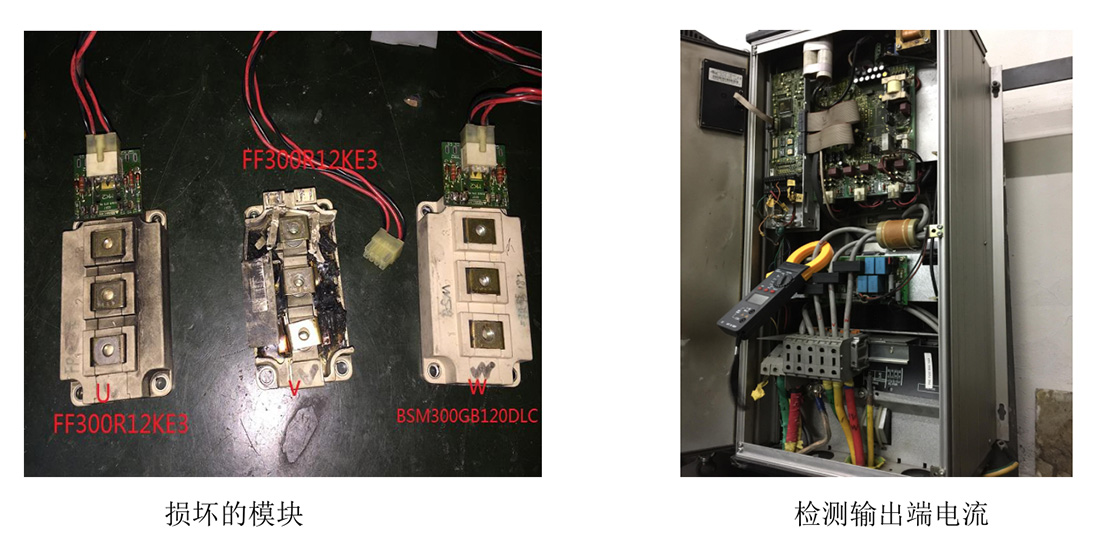 案例二:客戶反映故障報(bào)警“AL15”,為二次側(cè)電源故障,維修二次側(cè)電源電路。修好后現(xiàn)場裝機(jī)試機(jī),檢測輸出側(cè)三相電源電壓平衡正常,輸出頻率45HZ時(shí)三相輸出電流為135A左右正常。連續(xù)運(yùn)行3小時(shí)左右時(shí)變頻器發(fā)生故障停機(jī),現(xiàn)場檢測電源驅(qū)動(dòng)板未發(fā)現(xiàn)損壞,開關(guān)電源供電電路正常,驅(qū)動(dòng)電路6路未發(fā)現(xiàn)短路、開路現(xiàn)象。V相IGBT模塊損壞(型號(hào)為 FF300R12KE3),U、W 正常。