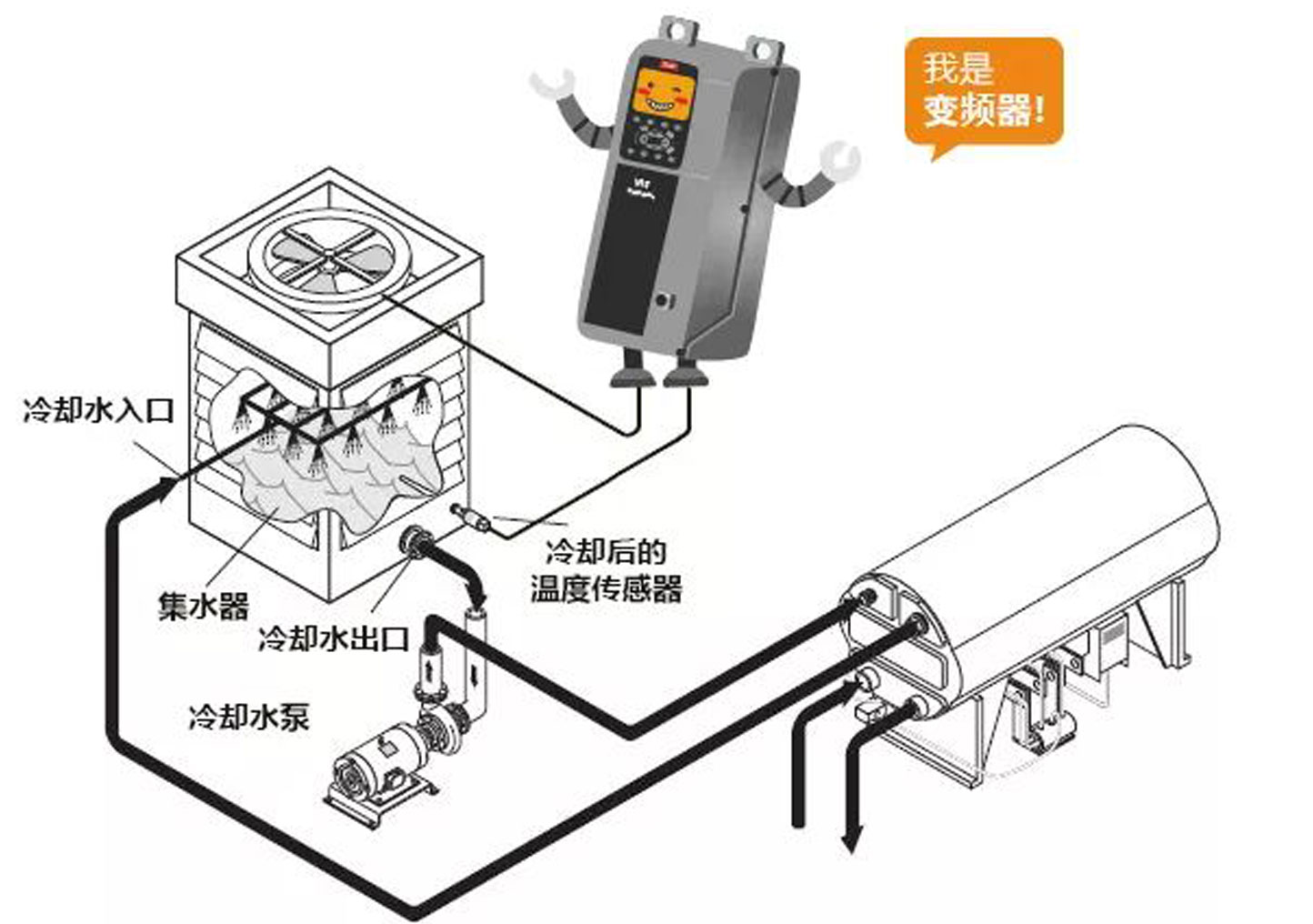 加入變頻器后,操作十分簡單,設定制冷機組所需要的冷卻水溫度、溫度傳感器必要參數(shù),變頻器便可對冷卻塔的散熱風機轉(zhuǎn)速進行實時的動態(tài)控制啦~
