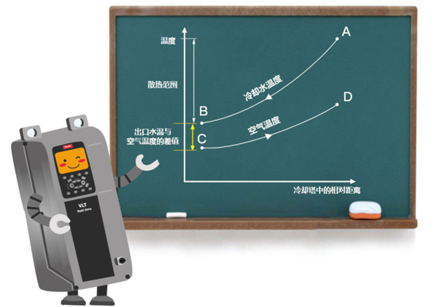剛才提到散熱效率,那究竟該如何衡量冷卻塔散熱效果呢?教給大家一個獨家秘笈,大家快看下黑板中的曲線吧~