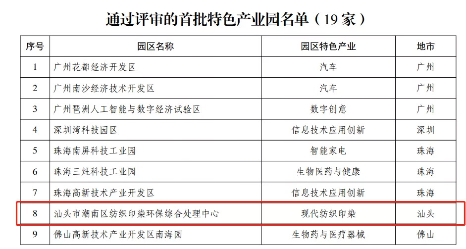 近日,廣東省工業(yè)和信息化廳網(wǎng)站發(fā)布《廣東省制造強省建設(shè)領(lǐng)導(dǎo)小組辦公室關(guān)于公布首批特色產(chǎn)業(yè)園名單的通知》,中信環(huán)境潮南區(qū)紡織印染環(huán)保綜合處理中心(以下簡稱中信環(huán)境潮南印染產(chǎn)業(yè)園)榜上有名,是現(xiàn)代紡織產(chǎn)業(yè)的唯一代表。