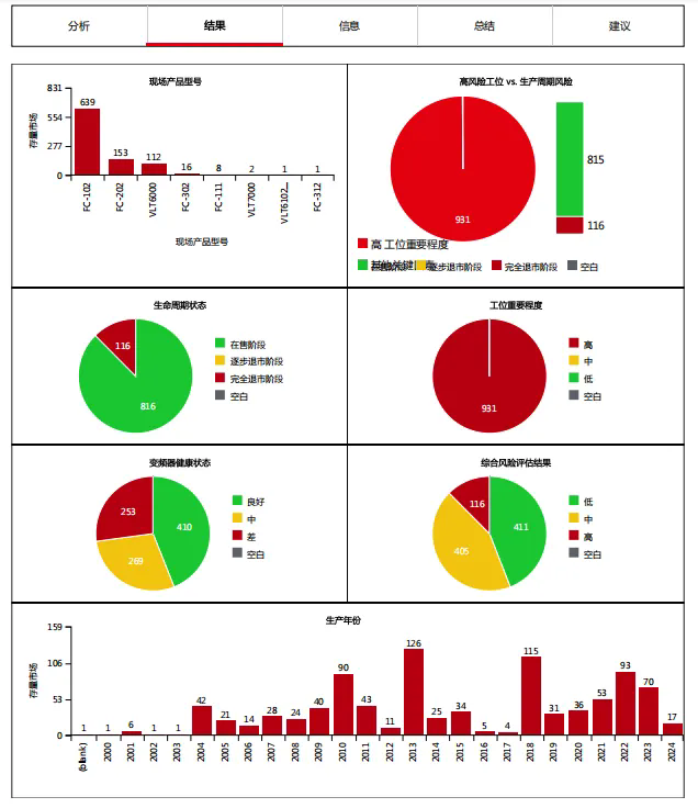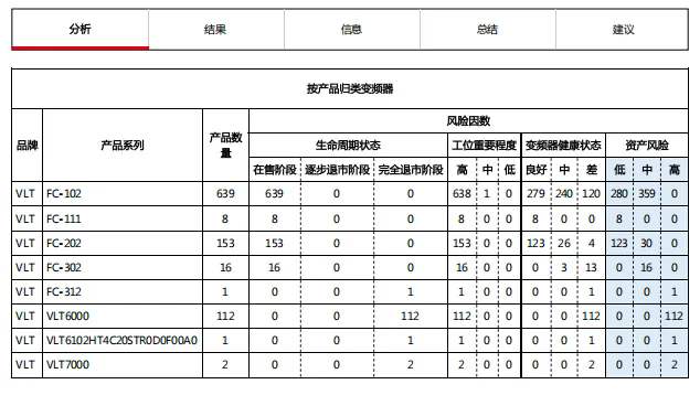 丹佛斯工程師帶領(lǐng)團(tuán)隊(duì),現(xiàn)場推進(jìn)評估工作。依據(jù)現(xiàn)場評估所獲取的數(shù)據(jù)信息可知,當(dāng)前該熱力公司在用的變頻器以丹佛斯FC102和FC202機(jī)型為主,有少量FC302和FC111機(jī)型,其中112臺已退市的VLT6000機(jī)型仍在使用,445臺變頻器已使用超過10年,253臺變頻器健康狀態(tài)較差。此次現(xiàn)場評估工作從變頻器健康狀態(tài)、生命周期、工位重要程度三個(gè)維度進(jìn)行了分析,幫助客戶梳理變頻器臺賬,排查故障,為后續(xù)的設(shè)備維保改造與預(yù)算制定計(jì)劃提供了依據(jù)。