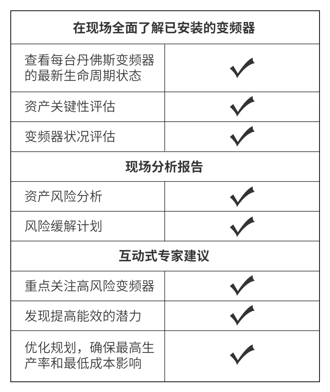 為了解決變頻器資產(chǎn)管理不足等問題,最大限度地減少供暖設(shè)備意外成本和停機(jī)時(shí)間,丹佛斯為該供熱公司提供了DrivePro® Site Assessment服務(wù),針對該供熱公司的所有變頻器進(jìn)行全面現(xiàn)場調(diào)查和風(fēng)險(xiǎn)分析并提供一份關(guān)于變頻器資產(chǎn)狀況、危急程度和生命周期狀態(tài)的詳細(xì)報(bào)告,優(yōu)化維護(hù)策略。