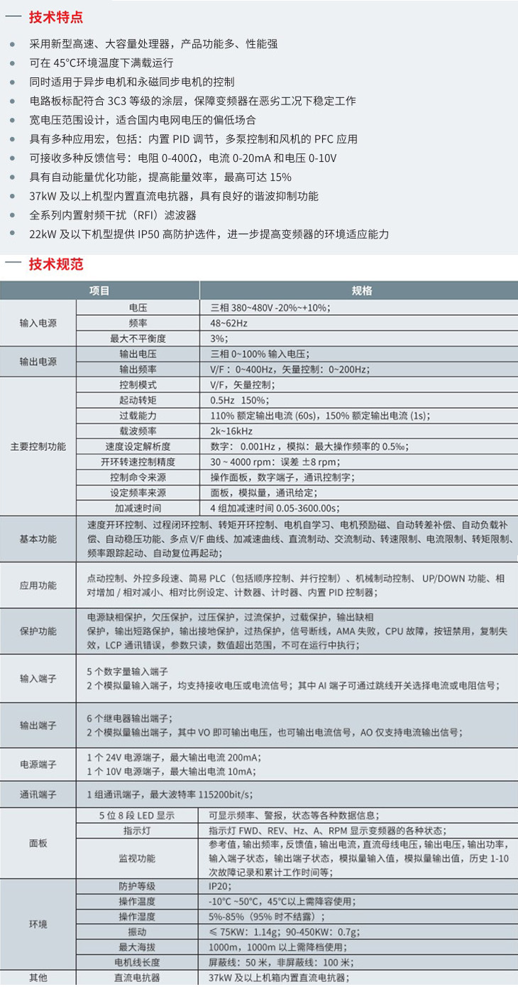具有多種應(yīng)用宏,包括:內(nèi)置PID調(diào)節(jié),多泵控制控制和風(fēng)機的PFC應(yīng)用
