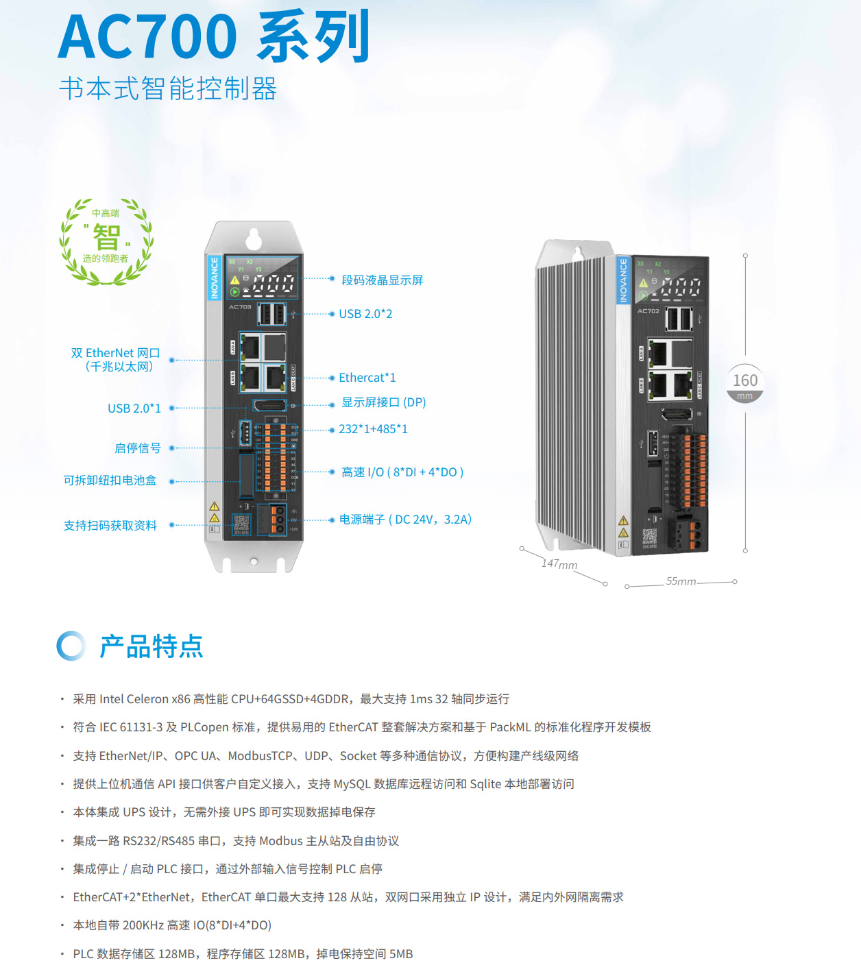 AC700系列書本式智能機(jī)械控制器,是基于Intel X86處理器硬件平臺,符合PLCopen規(guī)范和IEC-61131-3標(biāo)準(zhǔn)的高性能運(yùn)動控制器,支持ST,LD,SFC,CFC編程語言。標(biāo)配EtherCAT工業(yè)以太網(wǎng)實(shí)時總線,可以實(shí)現(xiàn)最大32軸同步控制。全系配置兩路千兆以太網(wǎng)口,支持EtherNet/IP與OPC UA等主流通訊協(xié)議,可以輕松的實(shí)現(xiàn)生產(chǎn)現(xiàn)場與IT系統(tǒng)的數(shù)據(jù)交互。同時,AC700本體集成UPS(不間斷電源),即無需外接UPS即可實(shí)現(xiàn)數(shù)據(jù)掉電保存。匯川在工業(yè)自動化領(lǐng)域超過7年的軟件平臺深度迭代開發(fā)與工藝算法庫積累,使其可以簡單、高效、穩(wěn)定的搭建設(shè)備應(yīng)用程序,尤其在高速、高精、高性能需求的大規(guī)模過程自動化、產(chǎn)線自動化和工廠自動化智能制造領(lǐng)域十分適用。