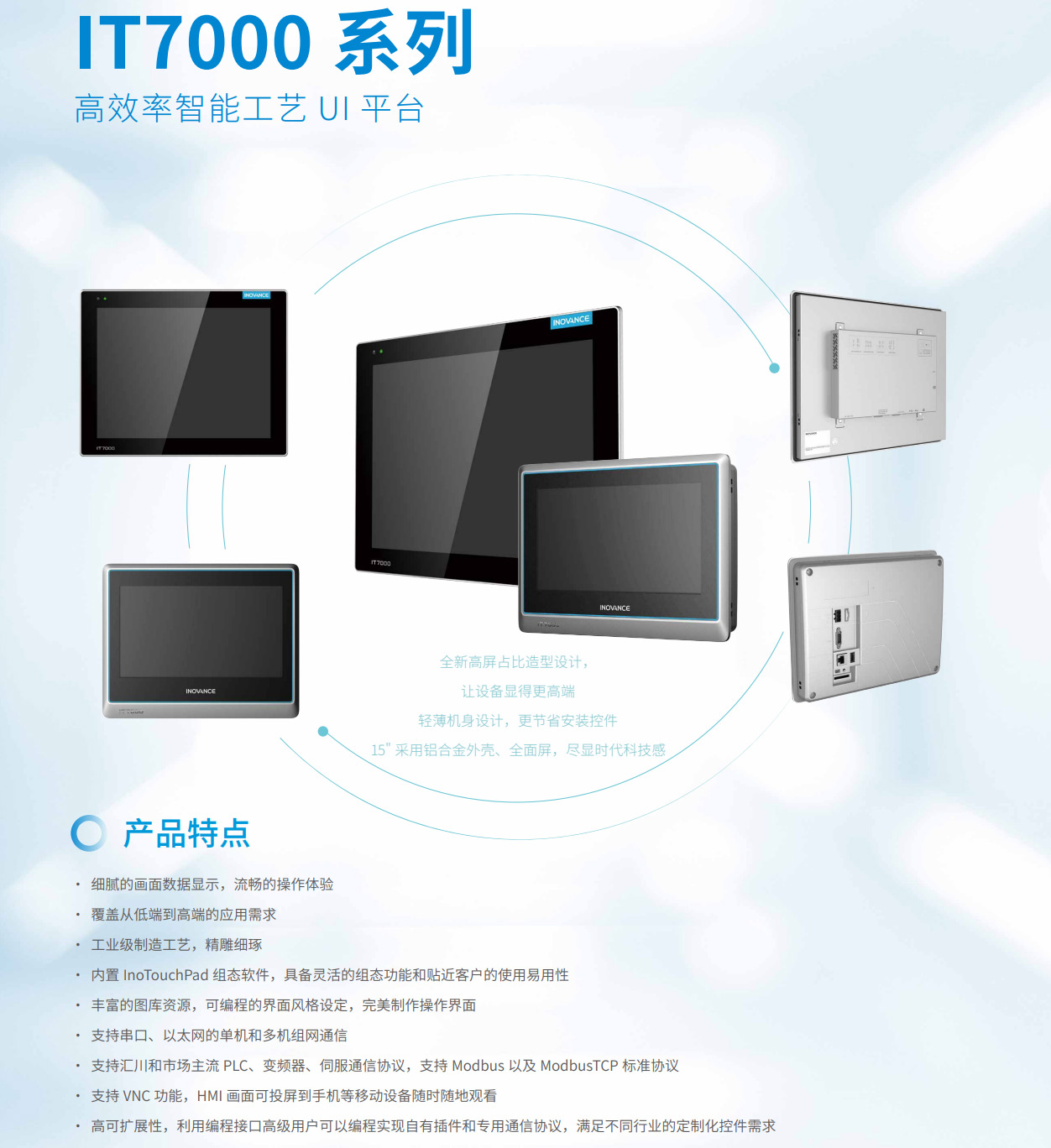 IT7000是匯川基于工控HMI發(fā)展趨勢(shì)研發(fā)的全新一代觸摸屏,在顯示效果上有顯著提升,與傳統(tǒng)HMI相比,IT7000通信更加豐富,功能更加全面,具有更強(qiáng)大的數(shù)據(jù)處理能力和更快的響應(yīng)速度。