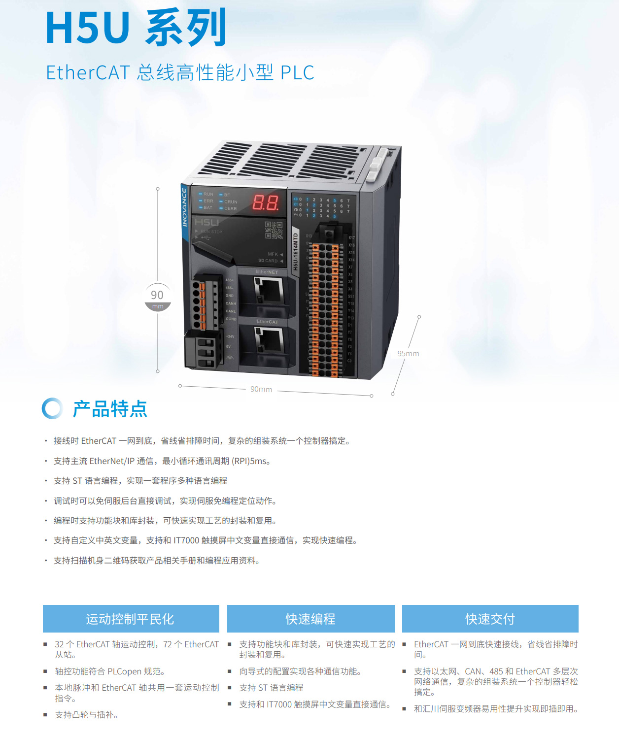 匯川技術(shù)推出首個(gè)應(yīng)用EtherCAT 總線的小型PLC H5U,讓線體設(shè)備飛速運(yùn)轉(zhuǎn)。隨著終端消費(fèi)日趨升級(jí),生產(chǎn)制造面臨巨大的壓力,而H5U 能夠簡(jiǎn)化布線量、加快編程調(diào)試時(shí)間、滿足帶軸能力的要求以及嚴(yán)苛的成本控制需求,從容應(yīng)對(duì)嚴(yán)峻的挑戰(zhàn),是將EtherCAT總線應(yīng)用到小型PLC 的先鋒之作。