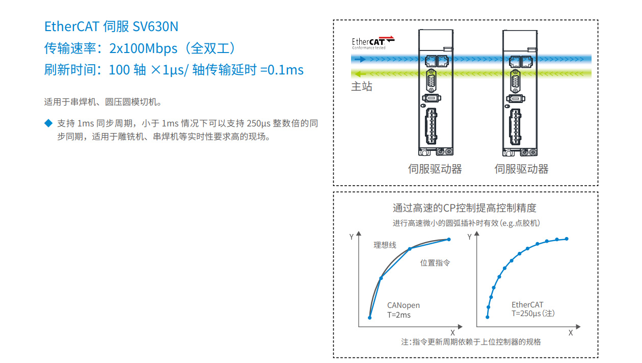 SV630 系列伺服是匯川技術(shù)研制的高性能中小功率的交流伺服產(chǎn)品。該系列產(chǎn)品功率范圍為0.05kW ~ 7.5 kW,采用以太網(wǎng)通訊接口,支持EtherCAT 、Modbus、CANopen 和CANLink 等通信協(xié)議,采用對應(yīng)的通信接口,配合上位機(jī)可實(shí)現(xiàn)多臺伺服驅(qū)動(dòng)器聯(lián)網(wǎng)運(yùn)行。